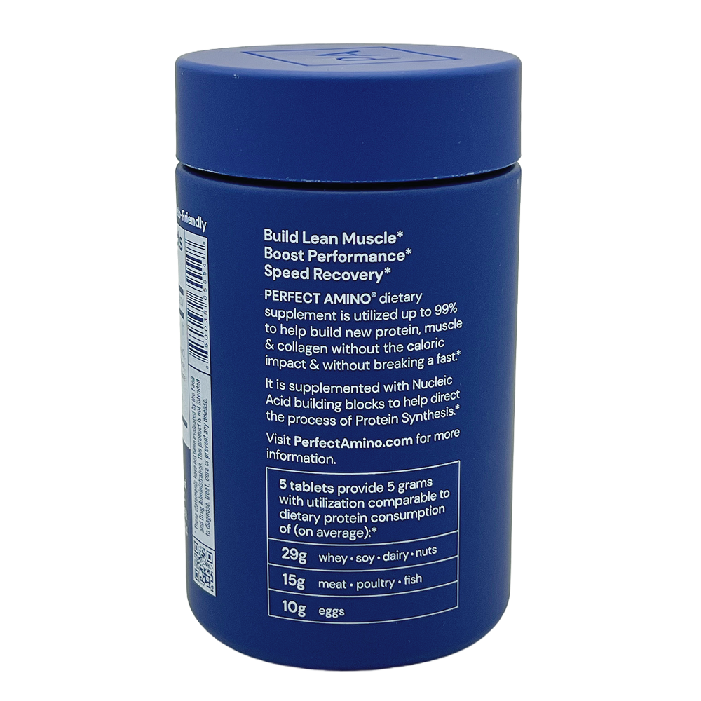Каждая порция (5 таблеток) содержит 5 г запатентованной смеси Perfect Amino™, включающей все незаменимые аминокислоты (лейцин, валин, изолейцин, лизин, фенилаланин, треонин, метионин, триптофан, гистидин) и комплекс нуклеиновых кислот. Упаковки из 150 таблеток достаточно для 30 порций (при приёме 5 таблеток в день).