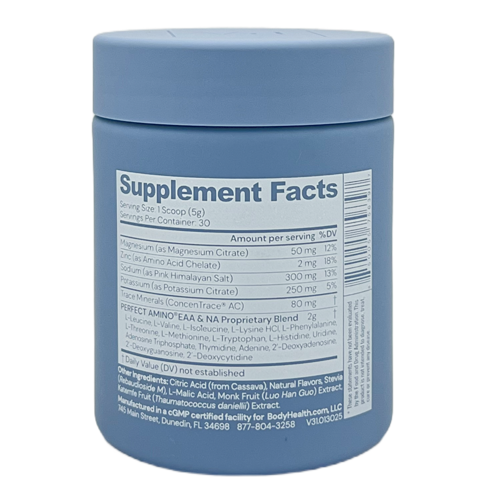При интенсивных физических нагрузках организм теряет с потом не только воду, но и электролиты (натрий, калий, магний), а также возрастает потребность в аминокислотах для восстановления мышечной ткани. Perfect Amino Electrolytes восполняет эти потери, обеспечивая незаменимые аминокислоты в легкоусвояемой форме (до 99% усвоения) и сбалансированный электролитный профиль. ConcenTrace® — это концентрированный ионный минеральный комплекс из вод Большого Солёного озера, содержащий 68 природных микроэлементов. Формула не содержит сахара, что делает её идеальной для гидратации без лишних калорий и скачков инсулина.