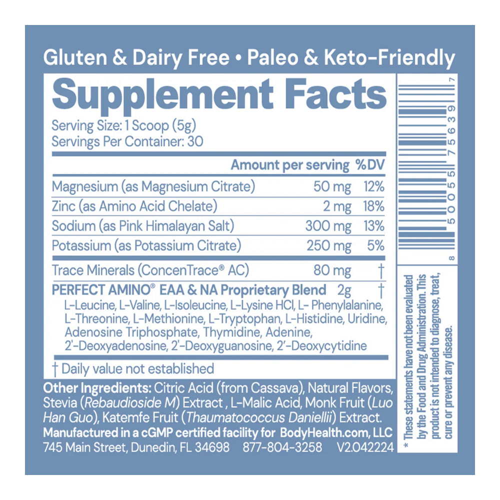 Каждая порция (1 мерная ложка, 5 г) содержит 2 г запатентованной смеси Perfect Amino™ (все незаменимые аминокислоты + нуклеиновые кислоты), 300 мг натрия, 250 мг калия, 50 мг магния, 2 мг цинка и 80 мг комплекса микроэлементов ConcenTrace®. Упаковки 150 г достаточно для 30 порций.