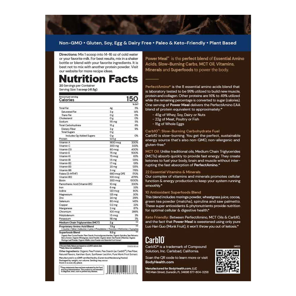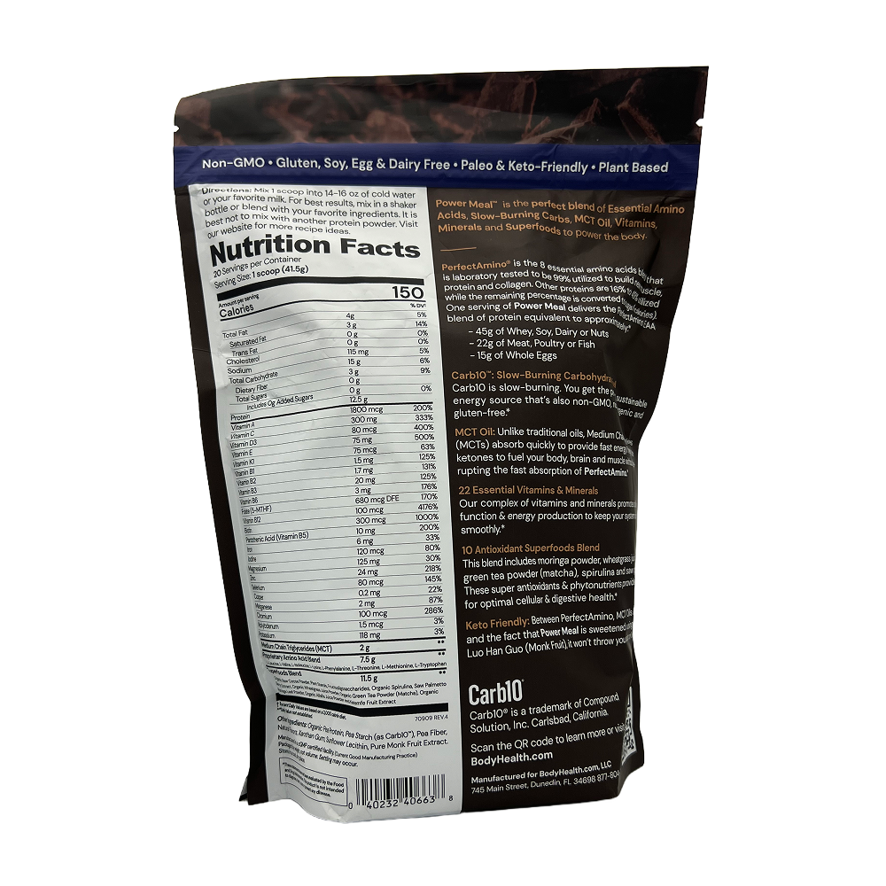 Power Meal Chocolate от BodyHealth — это инновационный энергетический коктейль, объединяющий запатентованную смесь незаменимых аминокислот PerfectAmino® (12,5 г на порцию) с медленными углеводами Carblo®, MCT-маслом, 22 витаминами и минералами, а также комплексом суперфудов и антиоксидантов. Формула разработана для обеспечения организма устойчивой энергией, поддержки мышечного роста и восстановления без скачков сахара и выхода из кетоза. Содержит 20 г растительного белка (эквивалент усвоения ~45 г сывороточного белка), подслащена только экстрактом монаха, не содержит ГМО, глютена, сои, яиц и молочных продуктов. Подходит для веганов, кето и палео.