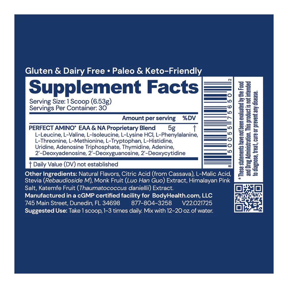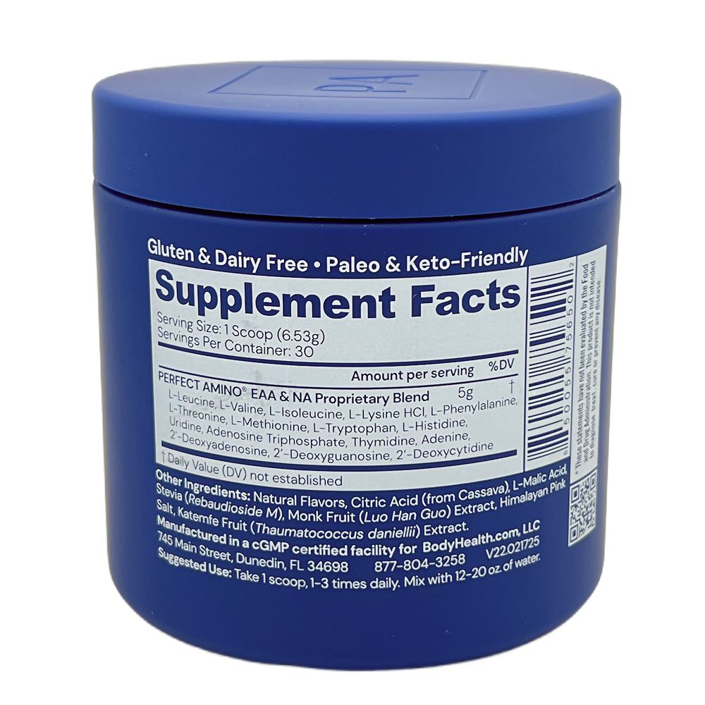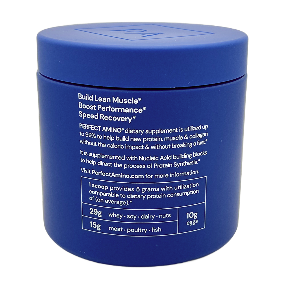 Каждая порция (1 мерная ложка, 6,53 г) содержит 5 г запатентованной смеси Perfect Amino™, включающей все незаменимые аминокислоты и комплекс нуклеиновых кислот. Упаковки 195,9 г достаточно для 30 порций.