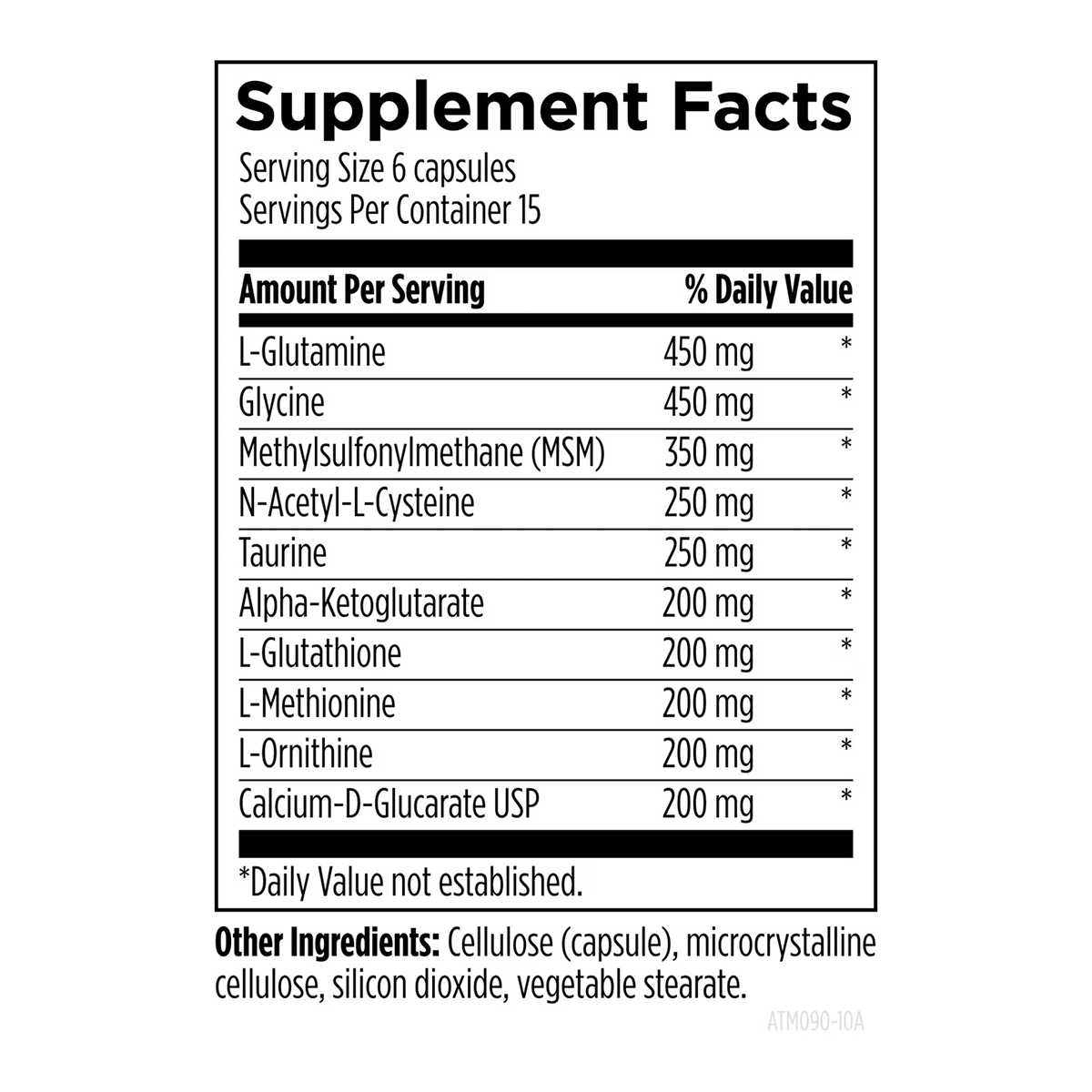 Содержит 10 ключевых компонентов: L-глютамин, глицин, MSM, N-ацетил-L-цистеин, таурин, альфа-кетоглутарат, L-глутатион, L-метионин, L-орнитин и D-глюкарат кальция. Эта синергичная комбинация поддерживает первую и вторую фазы детоксикации в печени, антиоксидантную защиту, метилирование и выведение токсинов.