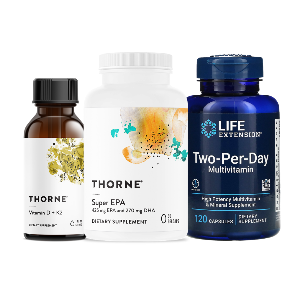 Комплект из трёх ключевых добавок, которые покрывают основные дефициты современного человека и обеспечивают синергетическую поддержку на клеточном уровне. Жидкий Витамин D/K2 (Thorne Research) сочетает витамин D3 и витамин K2 в форме MK-4 и MK-7 для оптимального усвоения кальция, здоровья костей, иммунитета, сердечно-сосудистой системы и предотвращения кальцификации сосудов. Two-Per-Day Multivitamin (Life Extension) — один из самых полных мультивитаминов с активными формами витаминов (включая метилированные B-витамины, натуральный витамин E, лютеин, зеаксантин, кверцетин, 5-MTHF и др.), который принимается дважды в день для стабильного уровня нутриентов в течение суток. Super EPA (Thorne Research) — высокоочищенный рыбий жир с высокой концентрацией EPA и DHA для поддержки мозга, сердца, суставов, снижения воспаления и нормального липидного профиля. Вместе эти три продукта формируют надёжную основу ежедневного питания: витамин D+K2 направляет кальций правильно, мультивитамин заполняет пробелы в рационе, а Омега-3 обеспечивает противовоспалительную защиту и поддержку мозга/сердца. Идеально для ежедневного базового приёма взрослым, особенно при несбалансированном питании, дефиците солнца, высоком уровне стресса или возрастных изменениях. Все продукты без ГМО, без искусственных добавок, с высокой степенью очистки и биодоступностью.
