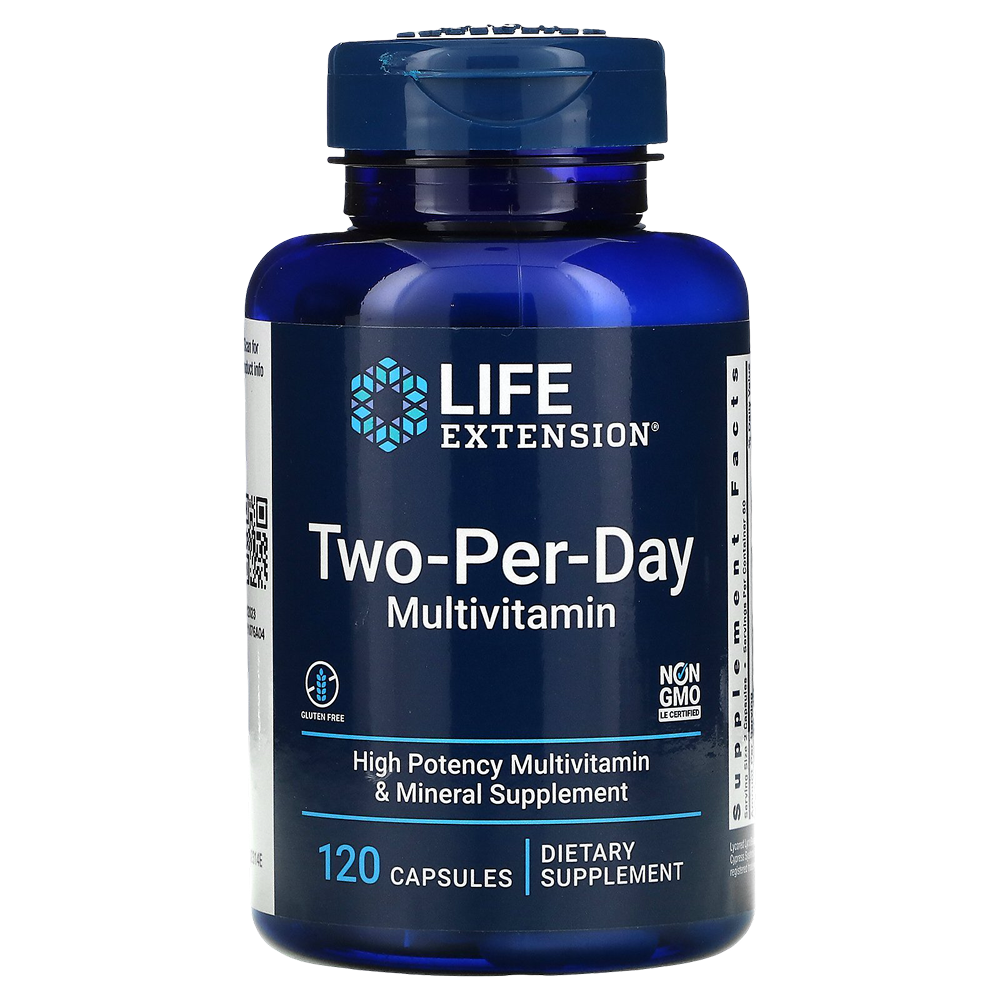 Two-Per-Day Multivitamin, Life Extension — принимать по 2 капсулы в день (можно разделить на утро и вечер) во время еды или по рекомендации врача.