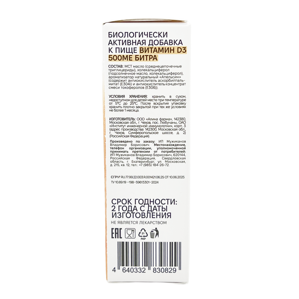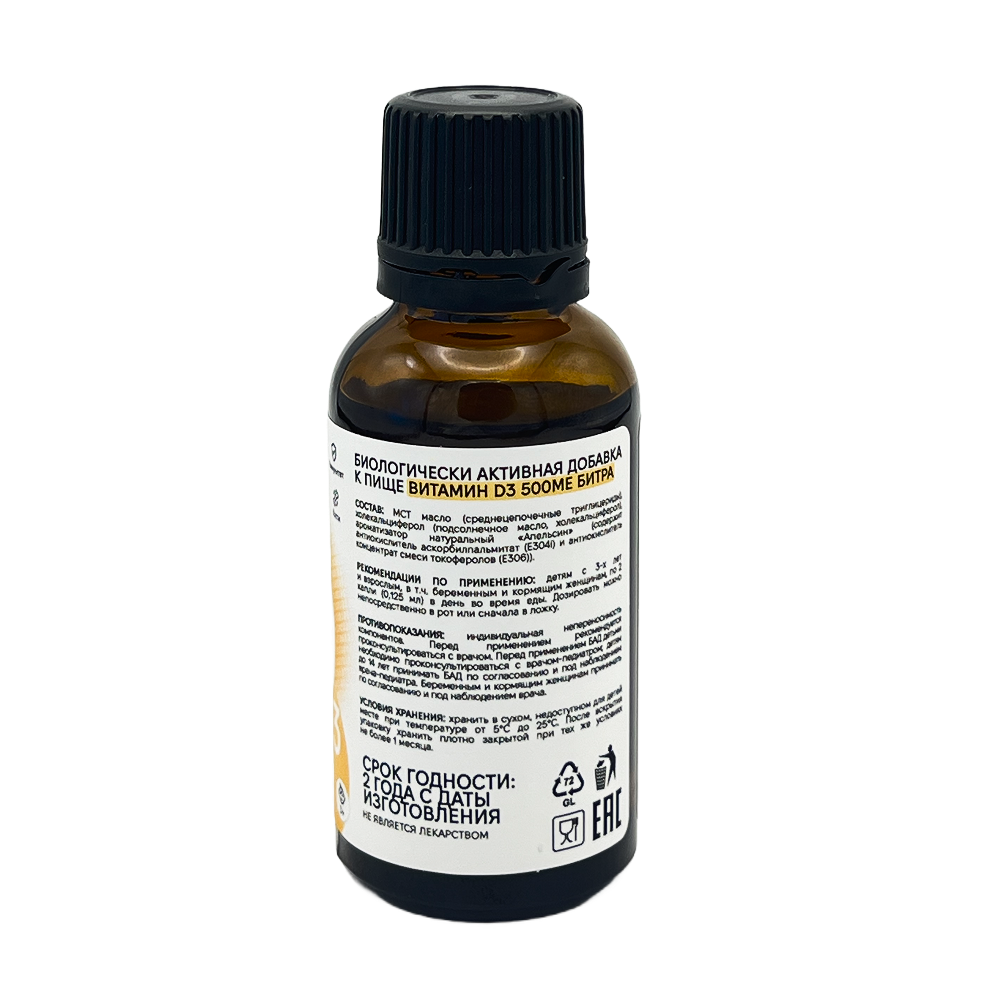 Наш витамин Д3 - готовая форма витамина Д3, растворенного в МСТ масле, полученного из высококачественного кокосового масла, обеспечивающего максимальную биодоступность. Он обеспечивает легкое поступление витамин Д, который играет важную роль на протяжении всей жизни. Жидкость с витамином Д3 не содержит сои, а для сохранения свежести используются смешанные токоферолы и витамин С (антиокислитель). Наш витамин Д3 подходит для детей, его можно принимать с 3 лет. MCT масло в составе оказывает множество полезных свойств для организма: улучшает качество микрофлоры кишечника, улучшает работу головного мозга, повышает физическую выносливость и не приводит к ожирению. Крышечка оснащена пипеткой, с которой удобнее отмерять необходимую дозировку.