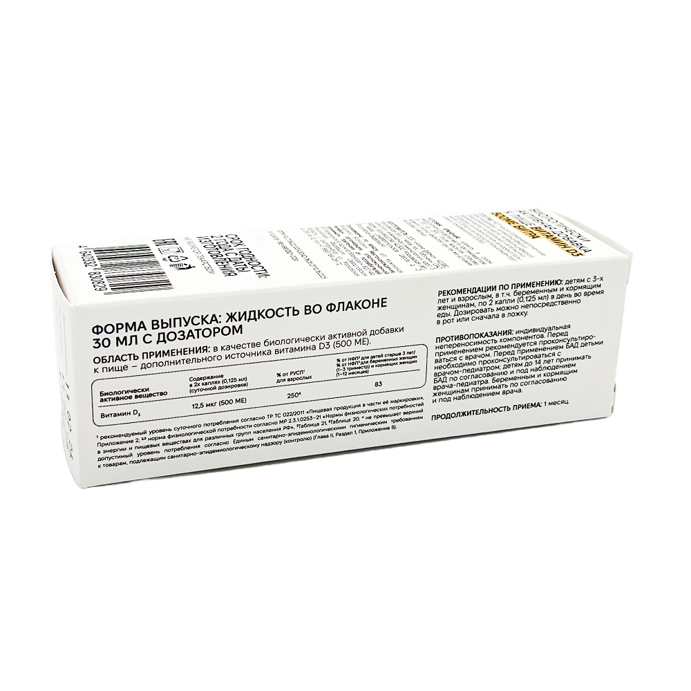 | * 1 капля содержит не менее 12,5 мкг (500 МЕ) витамина D3, что составляет 250% от рекомендуемого суточного потребления для взрослых (по нормам ТР ТС 022/2011, установленным для суточного потребления для взрослых и детей с 3 лет (83% от нормы физиологических потребностей в пищевых веществах). Физиологическая потребность для взрослых 15 мкг/сутки (600 МЕ), для лиц старше 65 лет - 20 мкг/сутки (800 МЕ), для детей - от 10 до 15 мкг/сутки. |