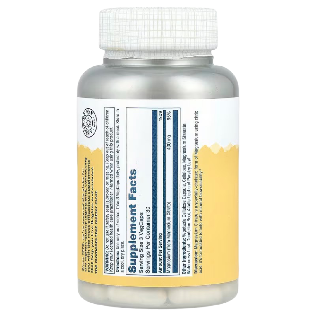 Solaray Magnesium Citrate представляет собой форму магния в виде цитрата, обеспечивающую повышенную биодоступность минерала. Каждая порция содержит 400 мг магния в легко усваиваемой форме, необходимой для оптимальной работы костей, мышц и нервной системы.