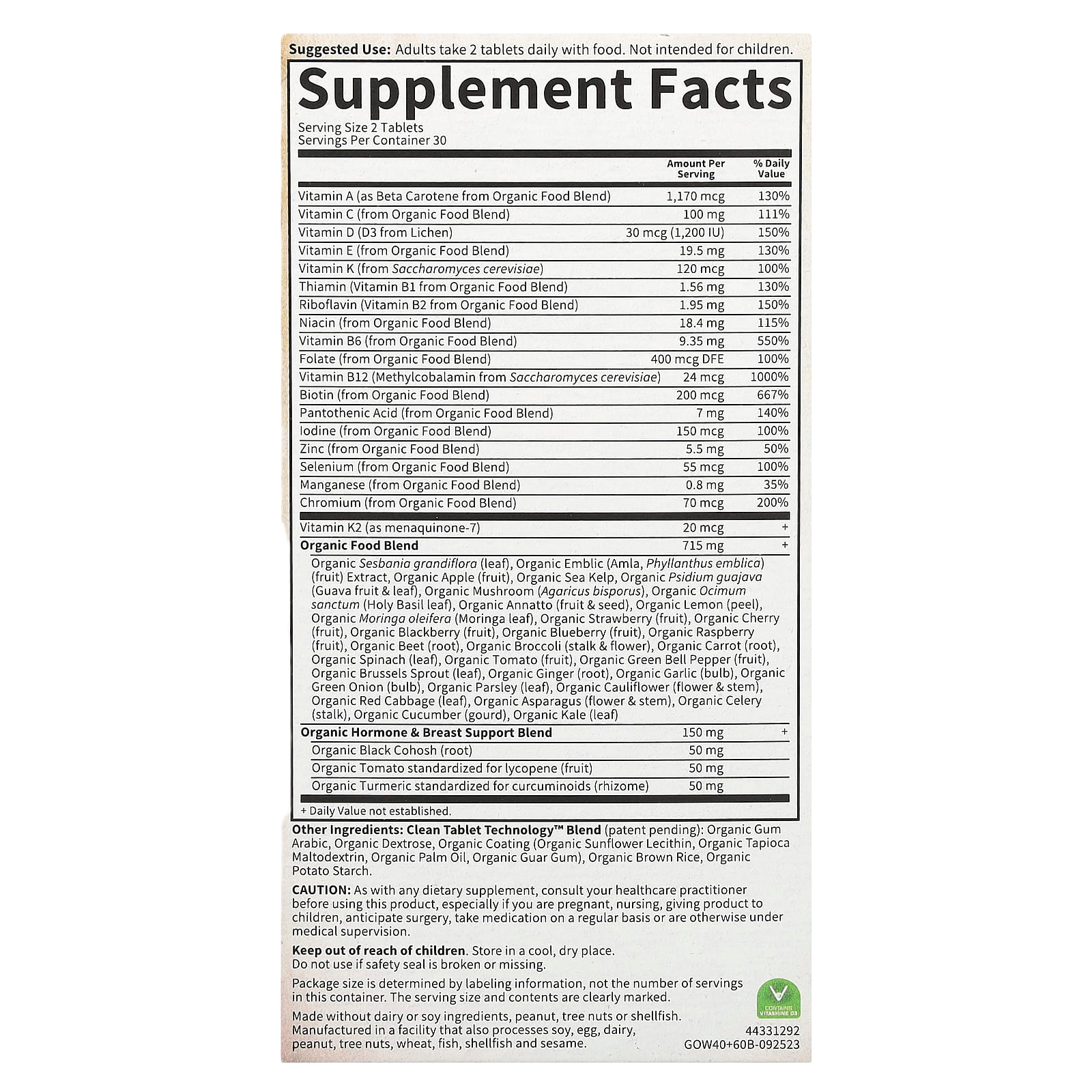 Другие ингредиенты: Смесь Clean Tablet Technology™ (в ожидании патента): органическая аравийская камедь, органическая декстроза, органическая оболочка (органический подсолнечный лецитин, органический мальтодекстрин из тапиоки, органическое пальмовое масло, органическая гуаровая камедь), органический коричневый рис, органический картофельный крахмал.
