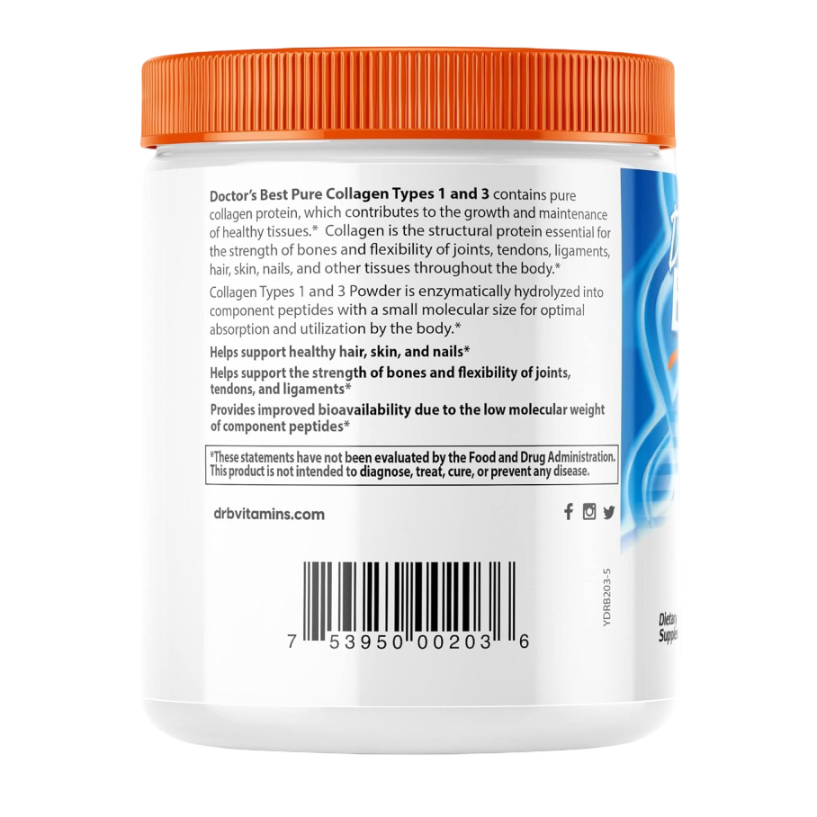 Коллаген 1 и 3 типа от Doctor's Best – это высококачественный порошок коллагена, который поможет вам сохранить молодость кожи и здоровье суставов! Этот продукт содержит чистый белок без вкусовых добавок и консервантов, что делает его идеальным выбором для тех, кто следит за своим здоровьем.