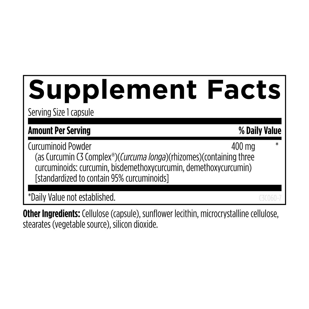 Каждая капсула содержит 400 мг экстракта Curcumin C3 Complex®, стандартизированного до 95% куркуминоидов. Упаковки из 60 капсул достаточно для 60 дней ежедневного приёма.
