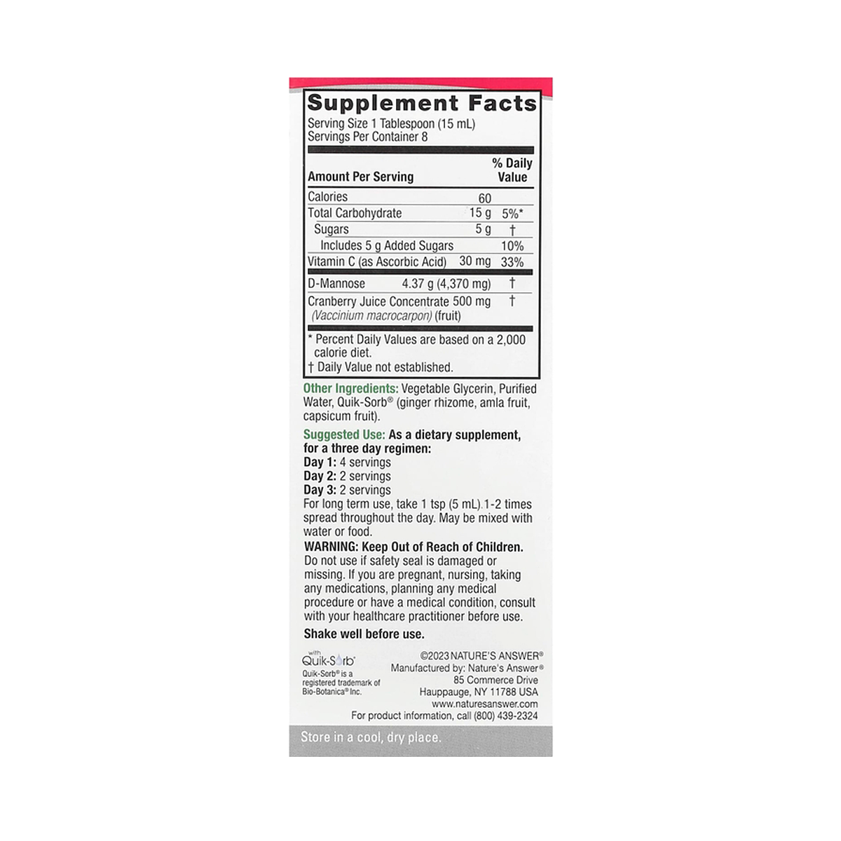 Cranberry D-Mannose от Nature's Answer — это концентрированная жидкая формула для поддержки здоровья мочевыводящих путей, объединяющая 4,37 г D-маннозы и 500 мг клюквенного концентрата на порцию. Специальный трёхдневный режим применения обеспечивает быстрое действие, а витамин C и комплекс Quik-Sorb® усиливают усвоение и эффективность. Продукт имеет приятный клюквенный вкус, не содержит спирта, глютена и ГМО, подходит для веганов.