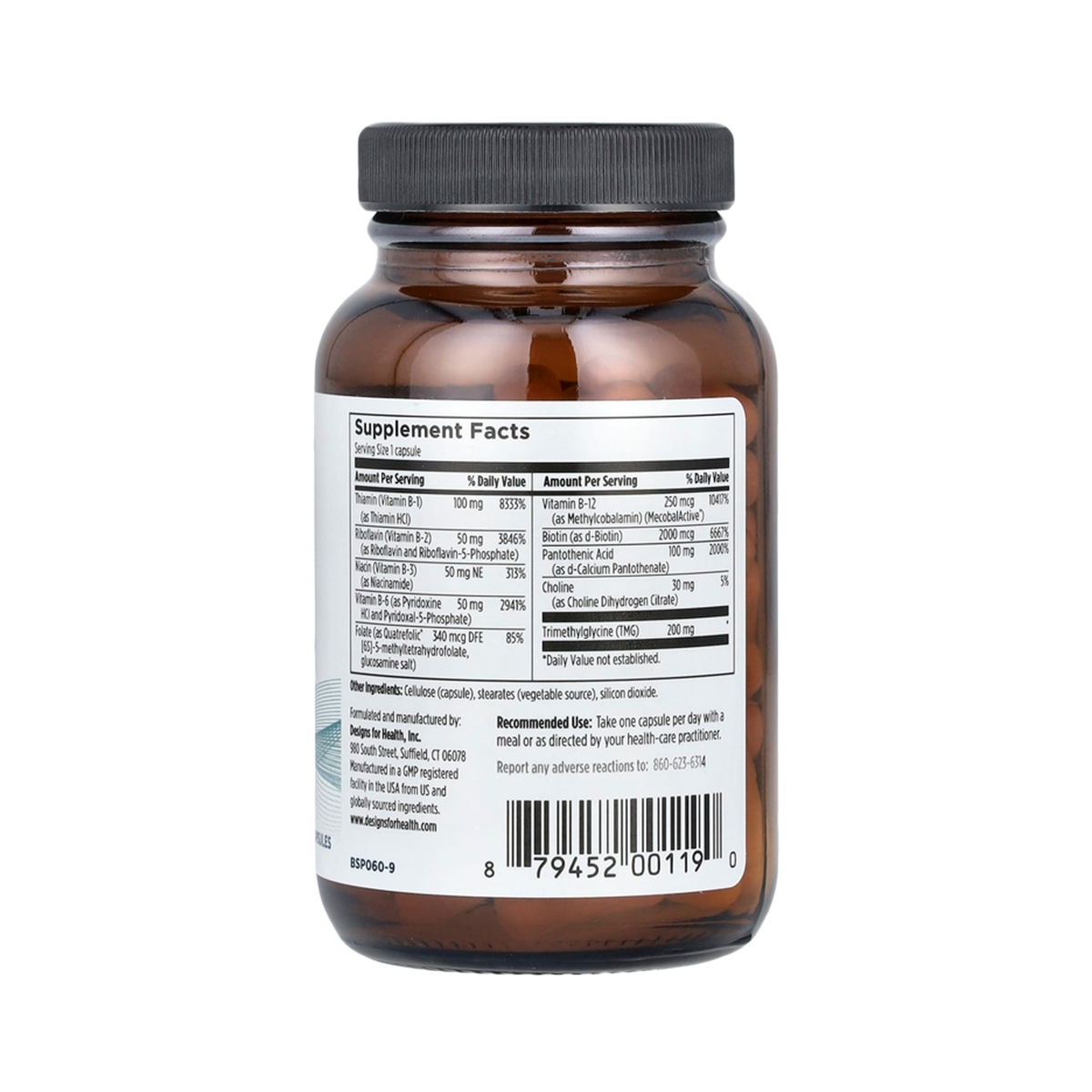 Каждая капсула содержит полный спектр витаминов B в клинически значимых дозировках, включая 100 мг B1, 50 мг B2, 50 мг ниацинамида, 50 мг B6 (с P-5-P), 340 мкг DFE фолата (Quatrefolic®), 250 мкг метилкобаламина, 2000 мкг биотина, 100 мг B5, 30 мг холина и 200 мг TMG. Упаковки из 60 капсул достаточно для 60 дней ежедневного приёма.