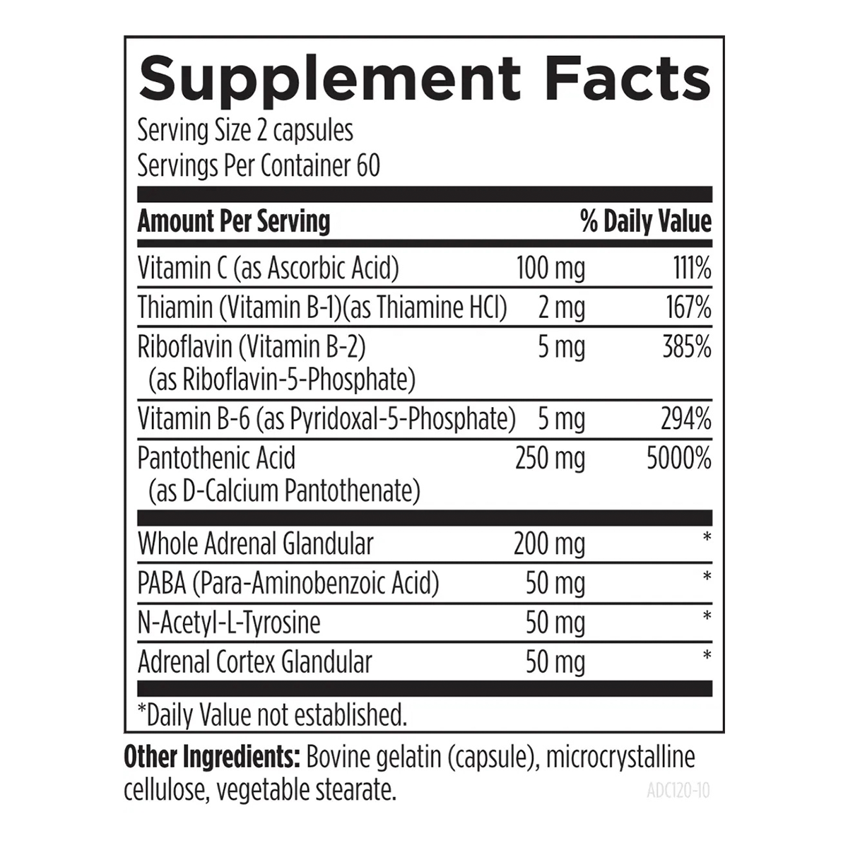 Каждая порция (2 капсулы) содержит 250 мг пантотеновой кислоты (5000% DV), 100 мг витамина C, 5 мг рибофлавина-5-фосфата, 5 мг P-5-P (B6), 2 мг тиамина, а также 200 мг цельных надпочечников, 50 мг коры надпочечников, 50 мг PABA и 50 мг N-ацетил-тирозина. Упаковки из 120 капсул достаточно для 60 дней ежедневного приёма.