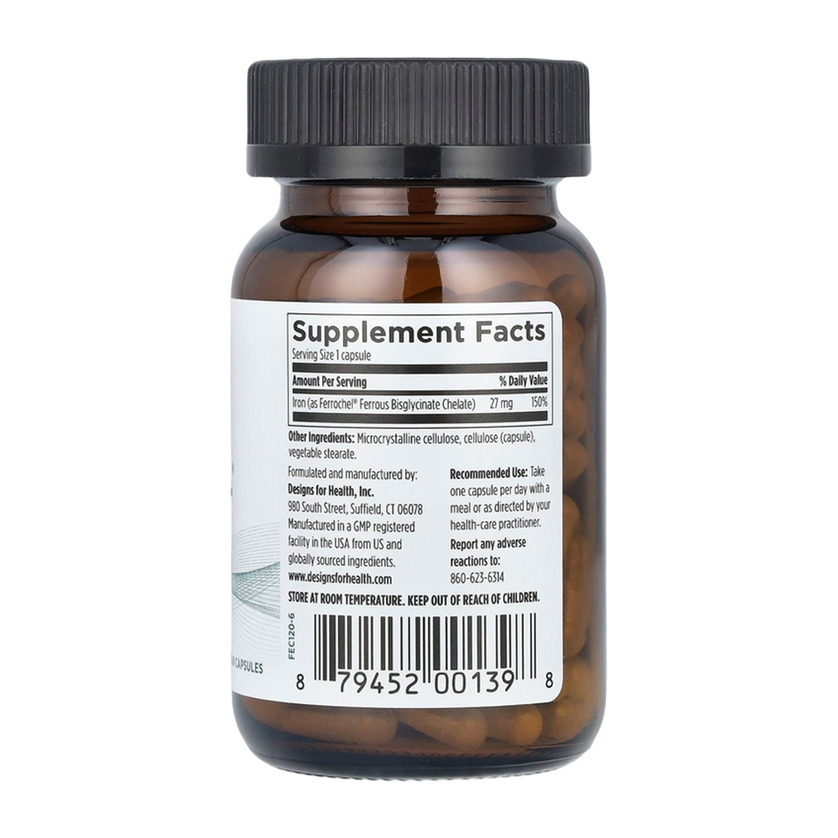 Каждая капсула содержит 27 мг элементарного железа (150% от суточной нормы). Упаковки из 120 капсул достаточно для 120 дней ежедневного приёма.